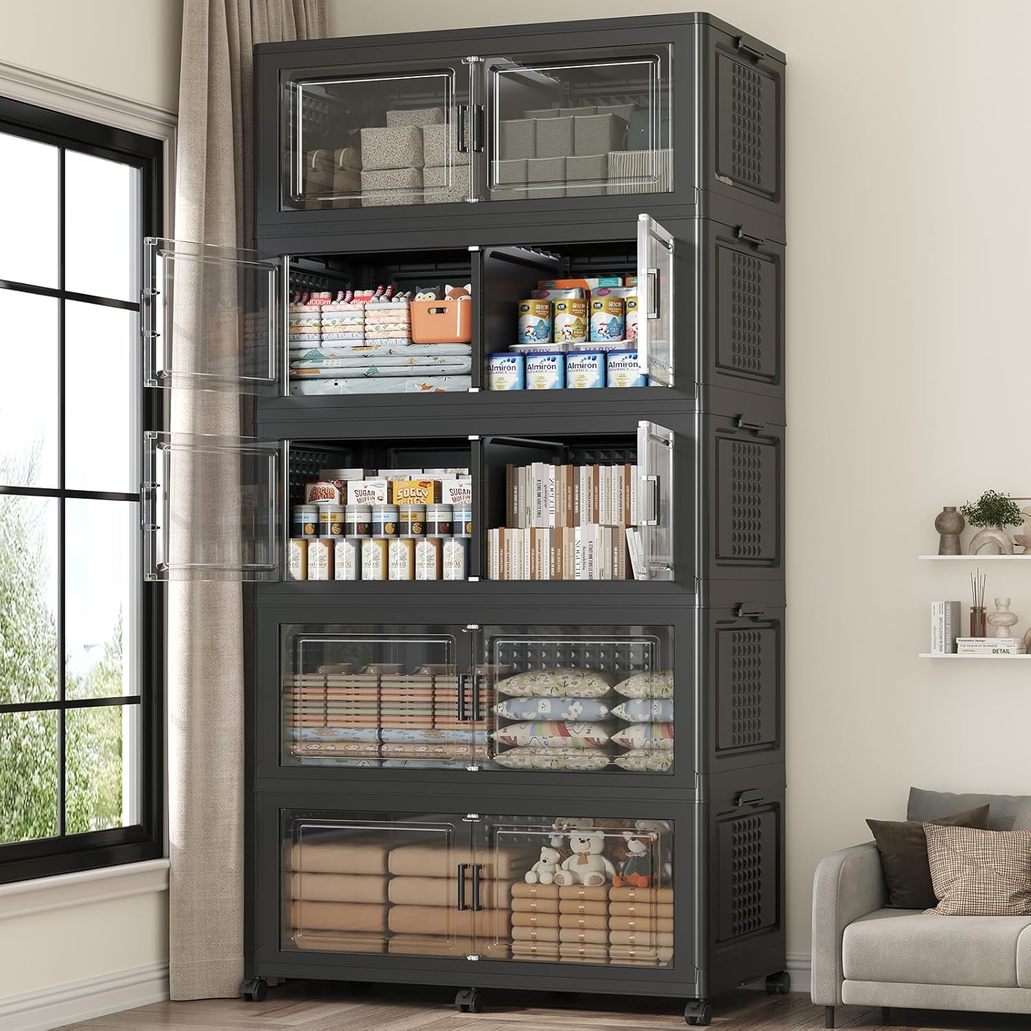 - ăTwo Ways to Open & Clear Magnetic DoorăThe collapsible storage bins with lids and wheels feature a dual access way, allowing for both top and front door openings, and with clear windows for easy visibility. The stackable plastic storage bins with open front doors are equipped with magnetic lock buckles to prevent dust from entering the cabinet.