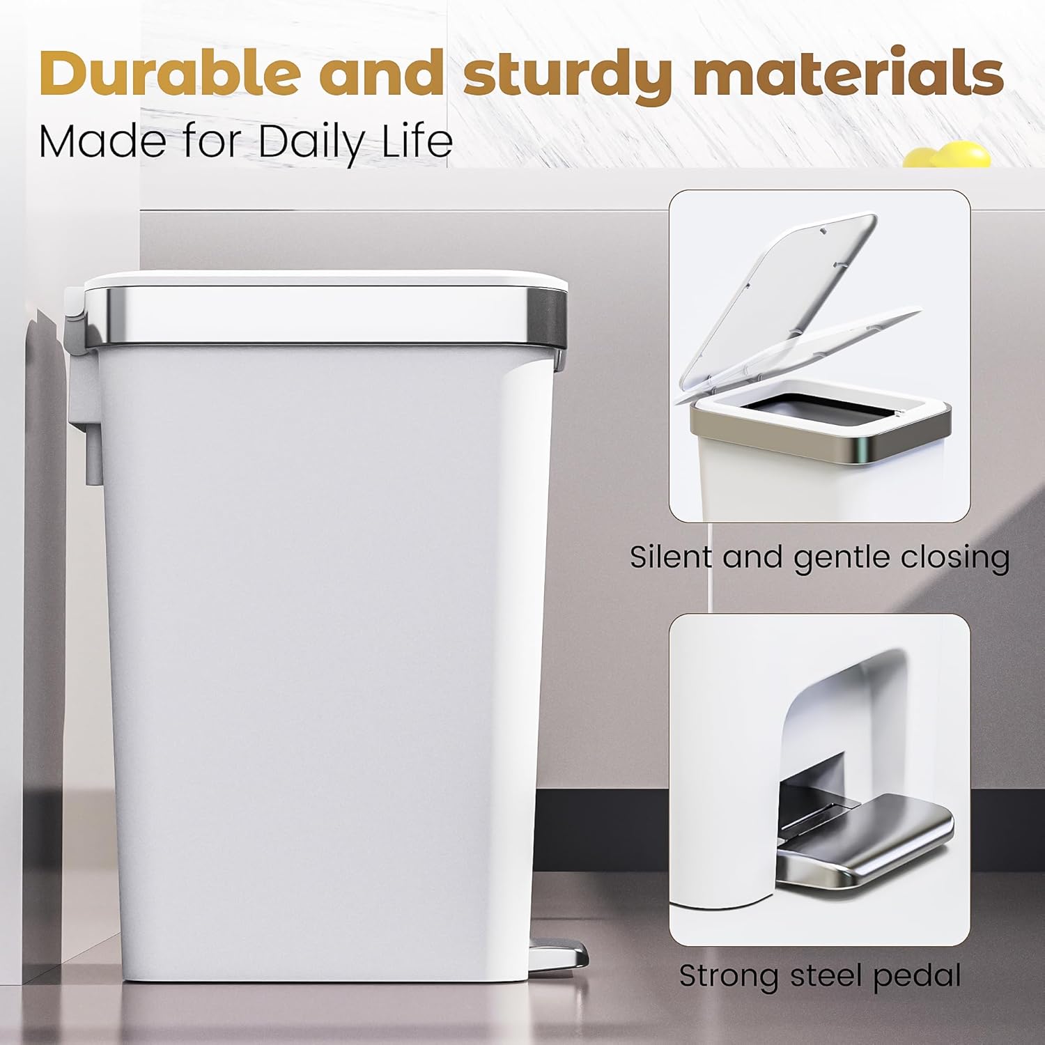 - Durable Metal Foot Pedal & Quality Plastic Construction: The foot pedal of the small white trash cans is made from durable metal, engineered to last over 100,000 steps. The small bathroom trash can with lid is designed for durability and reliability, making it an excellent choice for bathroom and office spaces.