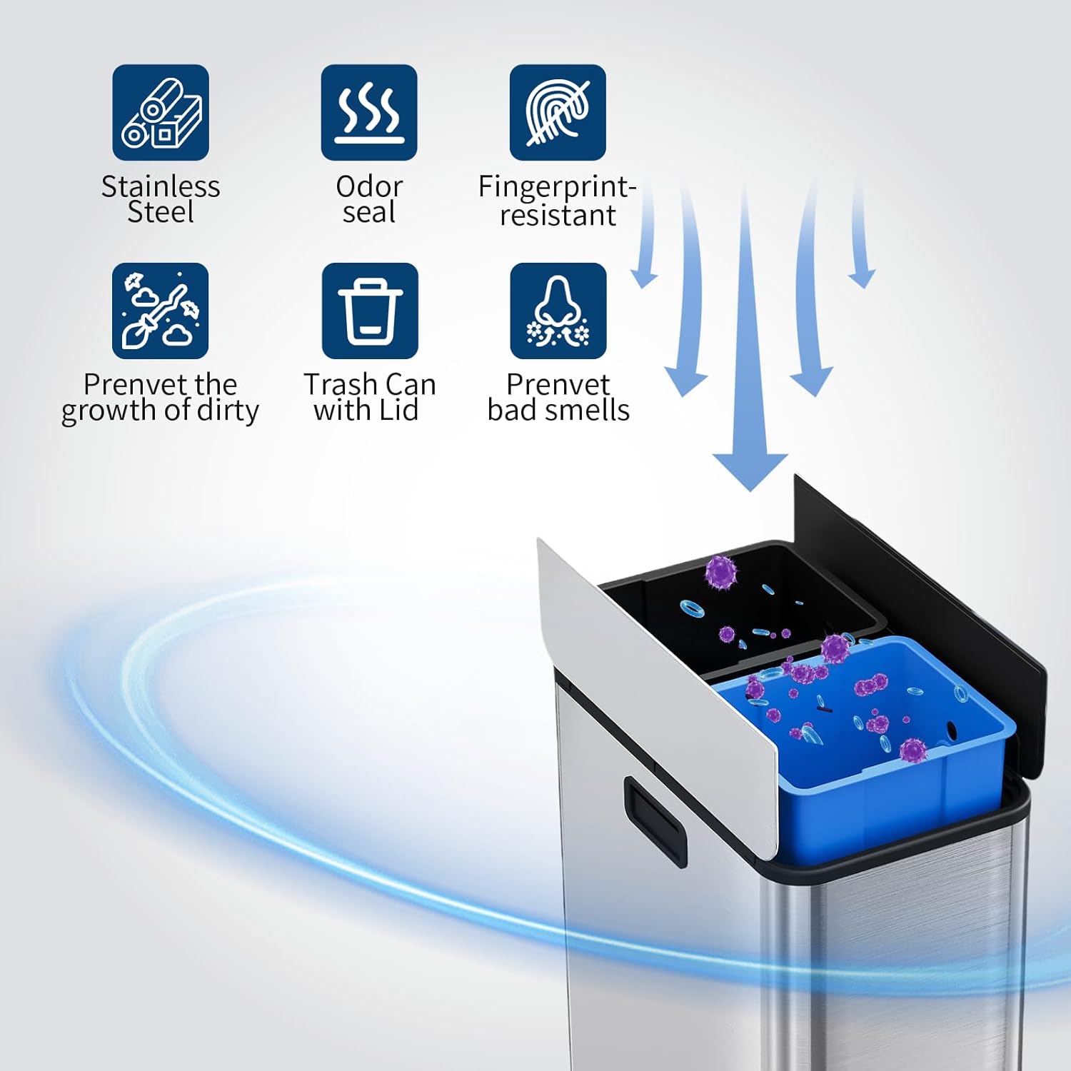 - Dual Compartments: Featuring two spacious 7.4-gallon compartments, this trash can is designed to meet your daily waste management needs with ease. Perfect for sorting your recyclables from regular waste, it ensures a cleaner, more organized home