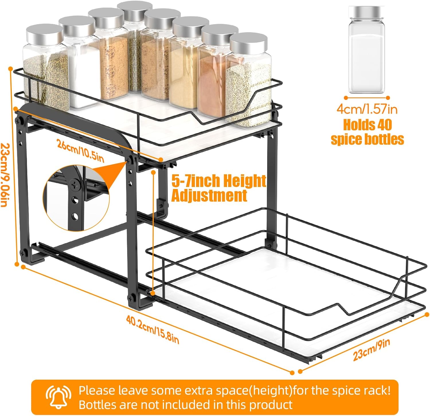 - Double-Tier Pull-Out Design for Maximum Storage: Maximize your cabinet or pantry space with our vertical spice rack pull out. The 2-tier design lets you store up to 40 spice jars (jars not included with this product), keeping your kitchen countertops clutter-free and your spices within easy reach. Each tier pulls out independently, so you get unobstructed access to all your items.