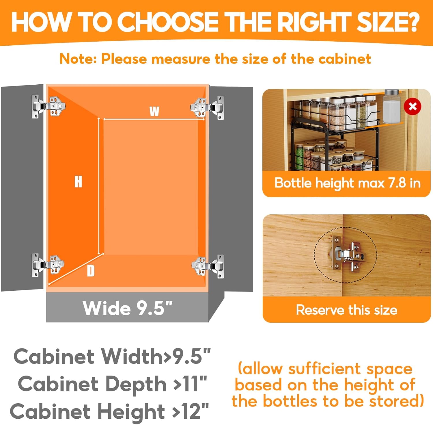 - Important Note: Spice organization for cabinet isn’t compatible with framed cabinets. Pull out spice rack for cabinets works with those having a width over 9.5", depth over 11", and height over 9.5". Before installation, carefully measure your cabinet's dimensions.