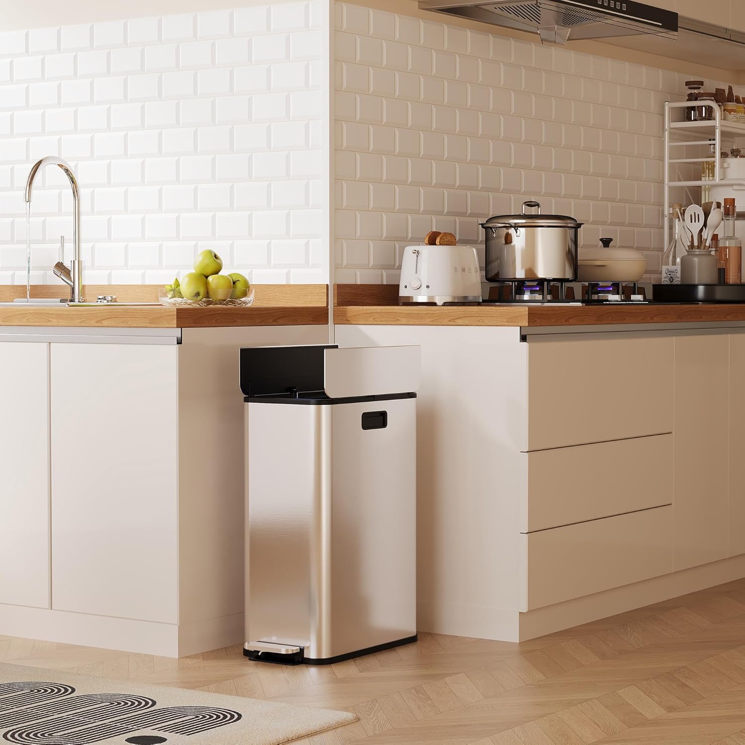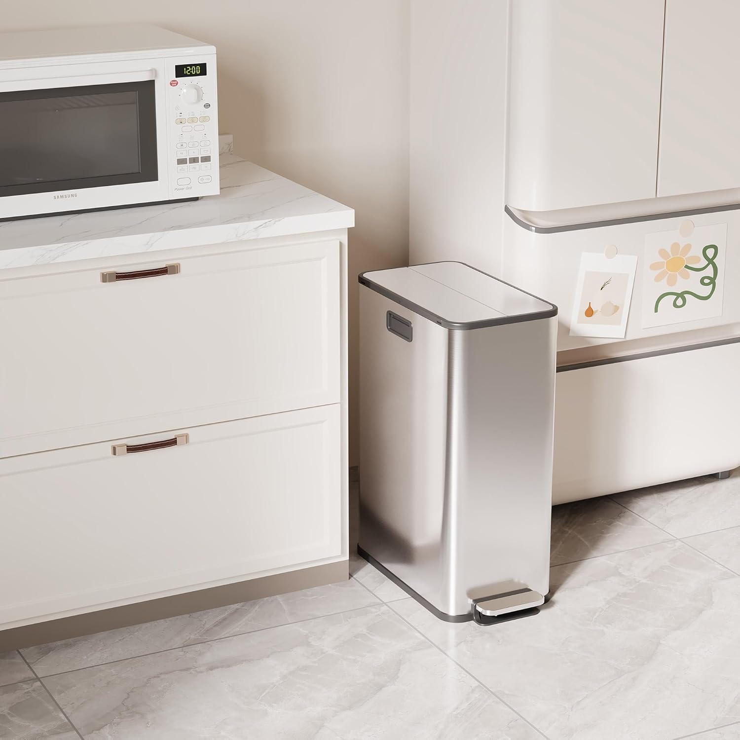 - Sleek and Easy to Maintain: Featuring an anti-fingerprint stainless steel finish, this trash bin not only enhances your kitchen's aesthetic but also simplifies cleaning. Keep your kitchen looking pristine without the hassle of frequent clean