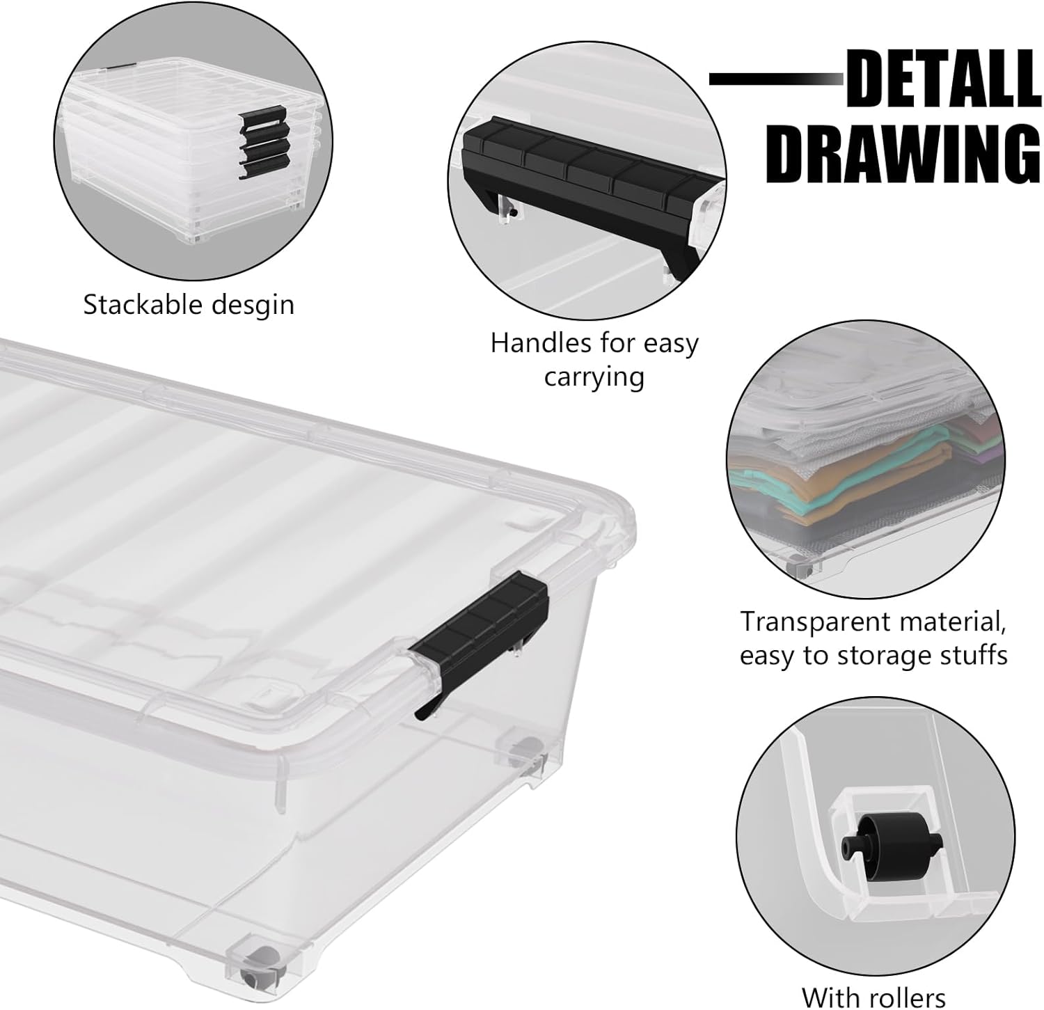25 Quart Under Bed Clear Latch Bin with Wheel, Plastic Under Bed Storage Box, 4 Pack