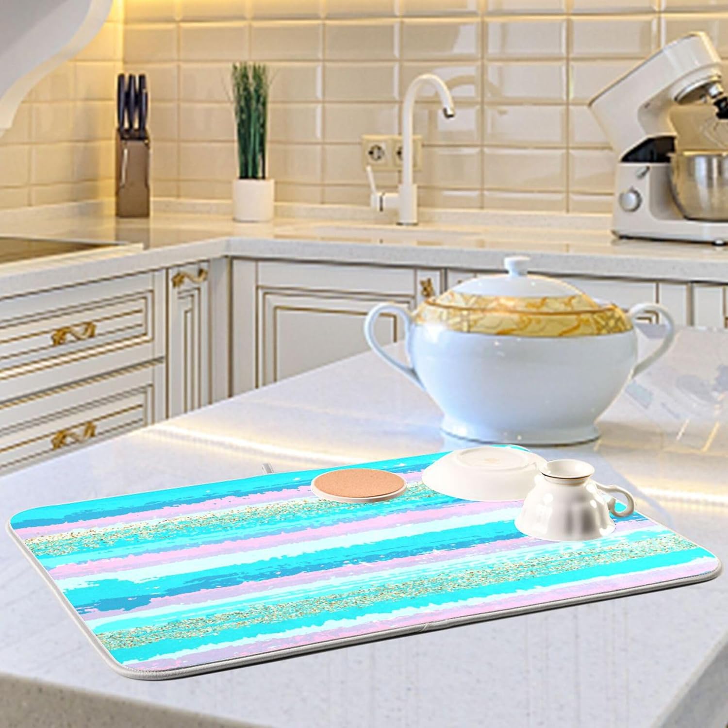 Turquoise Stripe Dish Drying Mat for Kitchen Countertop 16x18 Rectangle Teal Aqua Small Drying Mat Reusable Quick Dry Dish Sink Absorbent Mats Dishwasher Easy Clean Decorative Home Decor Essentials