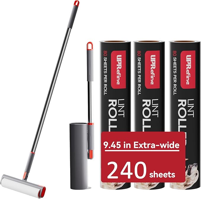- Extra Wide 9.45’’ & 240 Sheets:9.45inch extension includes a sticky roller, 240 sheets sticky paper, three poles, and a dust cover. Each roll of sticky paper has 80sheets, which is larger and longer than the market.9.45” extra wide design makes cleaning pet hair and other messes fast & easy.