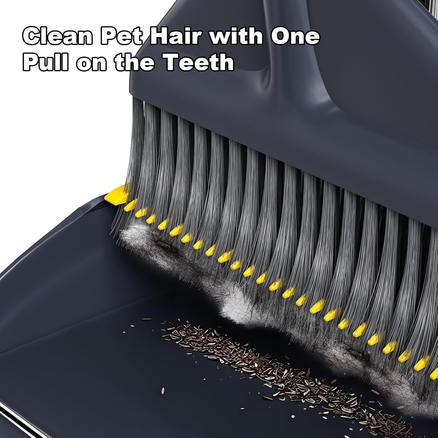 - Built-in Dustpan Teeth: Built in comb/Teeth for easy to Clean Broom into Dustpan , Clean Pet Hair and Human Hair with one Pull on the Teeth. The dustpan has a metal bead around the edge to ensure it sits flush with the floor, and the teeth make cleaning easy.