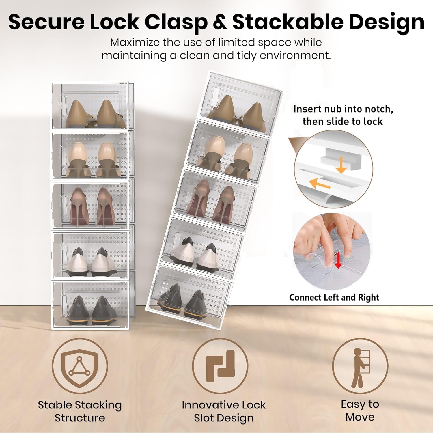 - Say goodbye to clutter and disorganization with our Shoe Storage Boxes, designed to offer superior durability, convenience, and versatility. Whether you're a sneakerhead or just need extra space for your footwear, these boxes are the perfect solution for keeping your shoes and other items neatly organized.