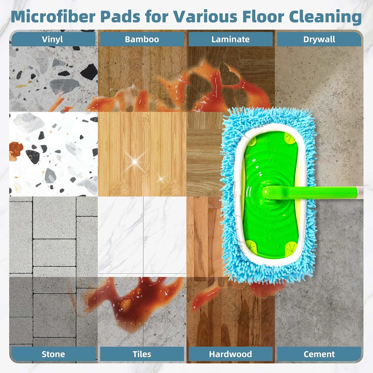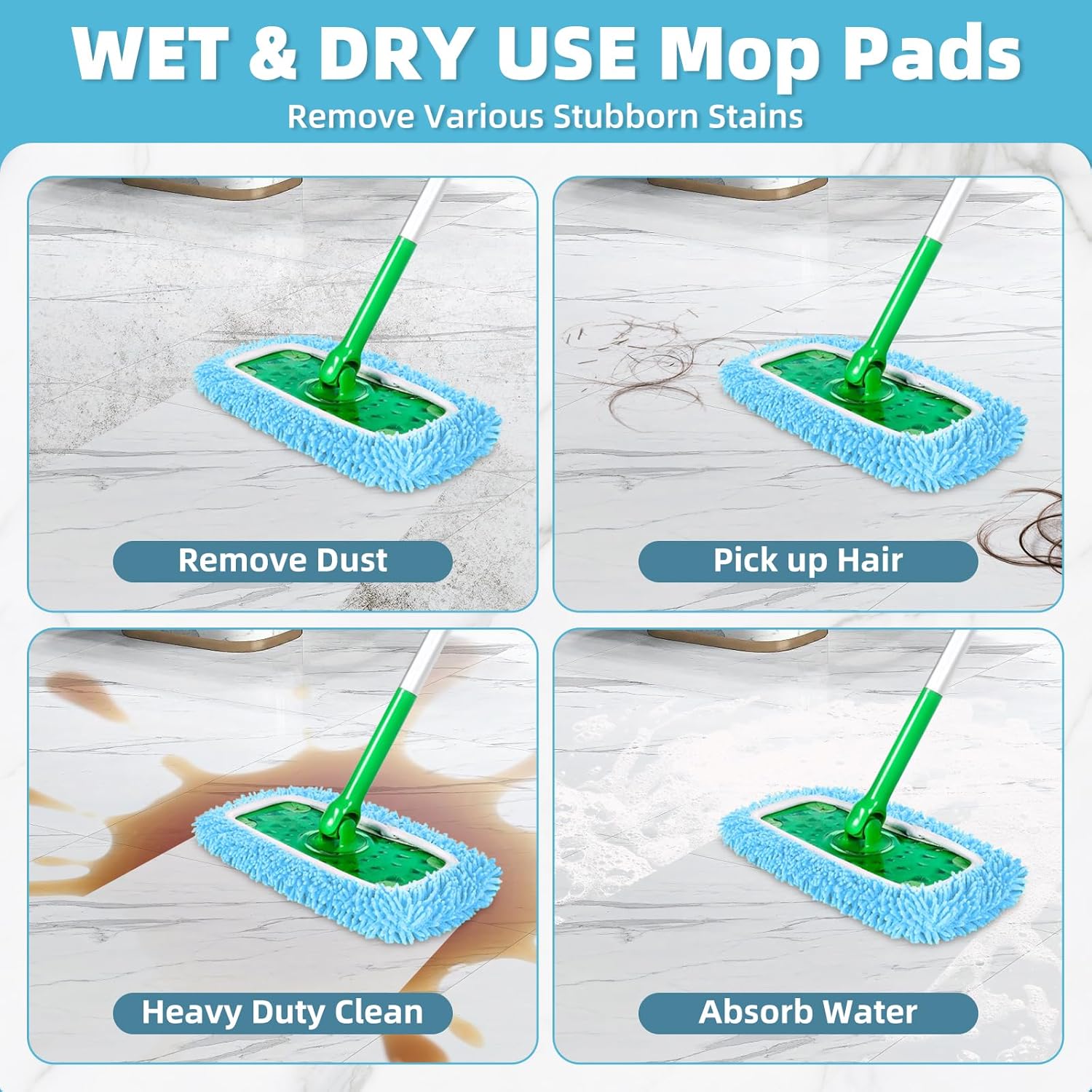 Reusable Mop Pads Compatible with Swiffer Sweeper Mop, Washable Wet Pads Refill & Chenille Dry Sweeping Cloths, Microfiber Mop Pads for Use on All Sealed Floors - Wood, Laminate, Stone & Tile (6 Blue)