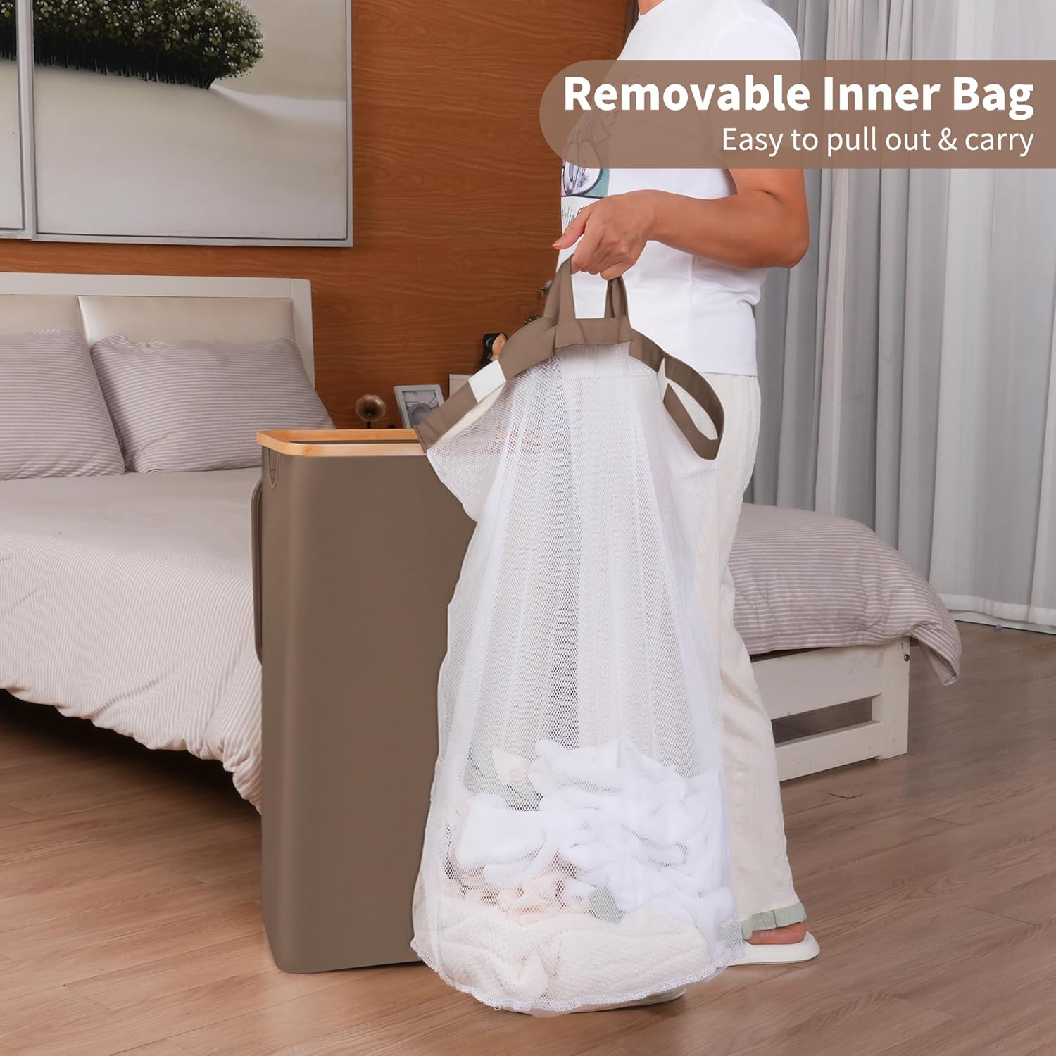 26 Gal Laundry Basket with Lid and Net Bag, Tall Laundry Hamper with Bamboo Handles, Aesthetic Dirty Clothes Bin for Laundry Room, Bathroom, Bedroom and Dorm, Brown