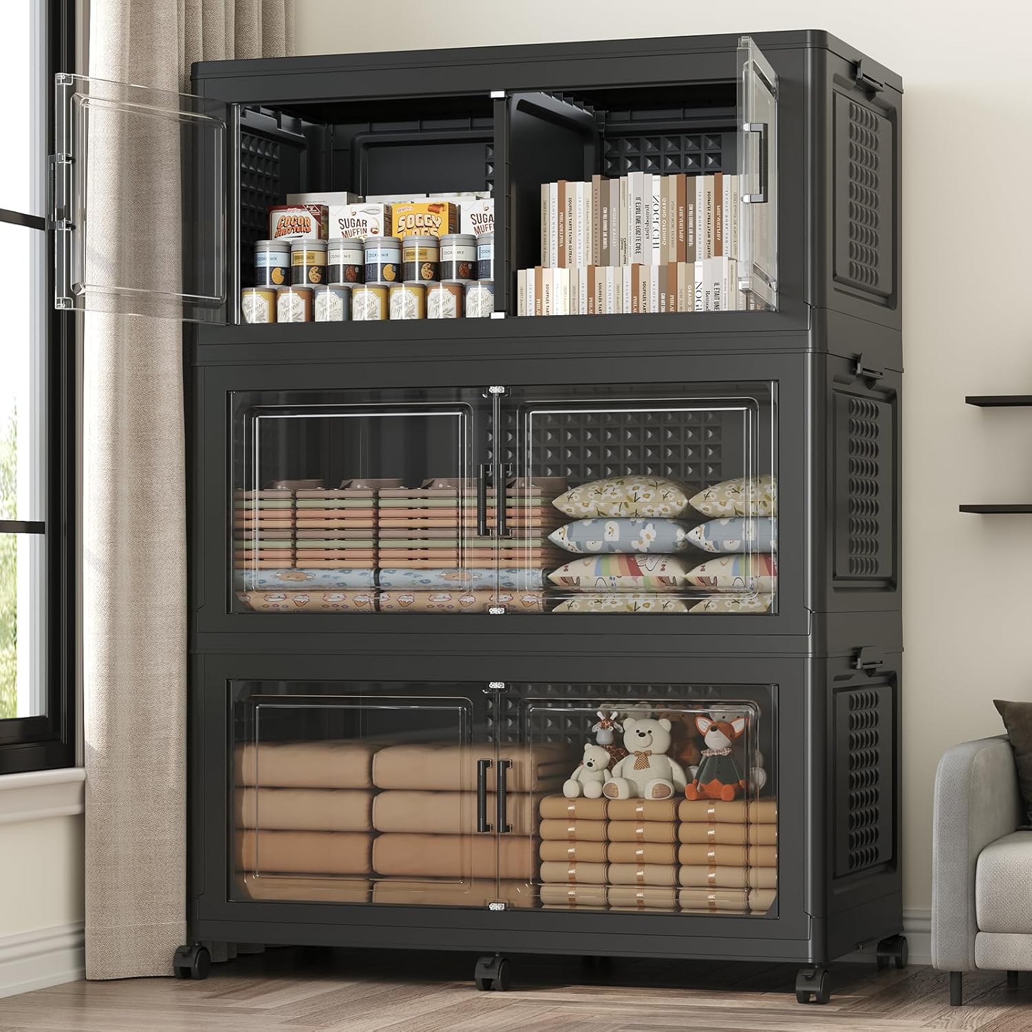 - ăTwo Ways to Open & Clear Magnetic DoorăThe collapsible storage bins with lids and wheels feature a dual access way, allowing for both top and front door openings, and with clear windows for easy visibility. The stackable plastic storage bins with open front doors are equipped with magnetic lock buckles to prevent dust from entering the cabinet.