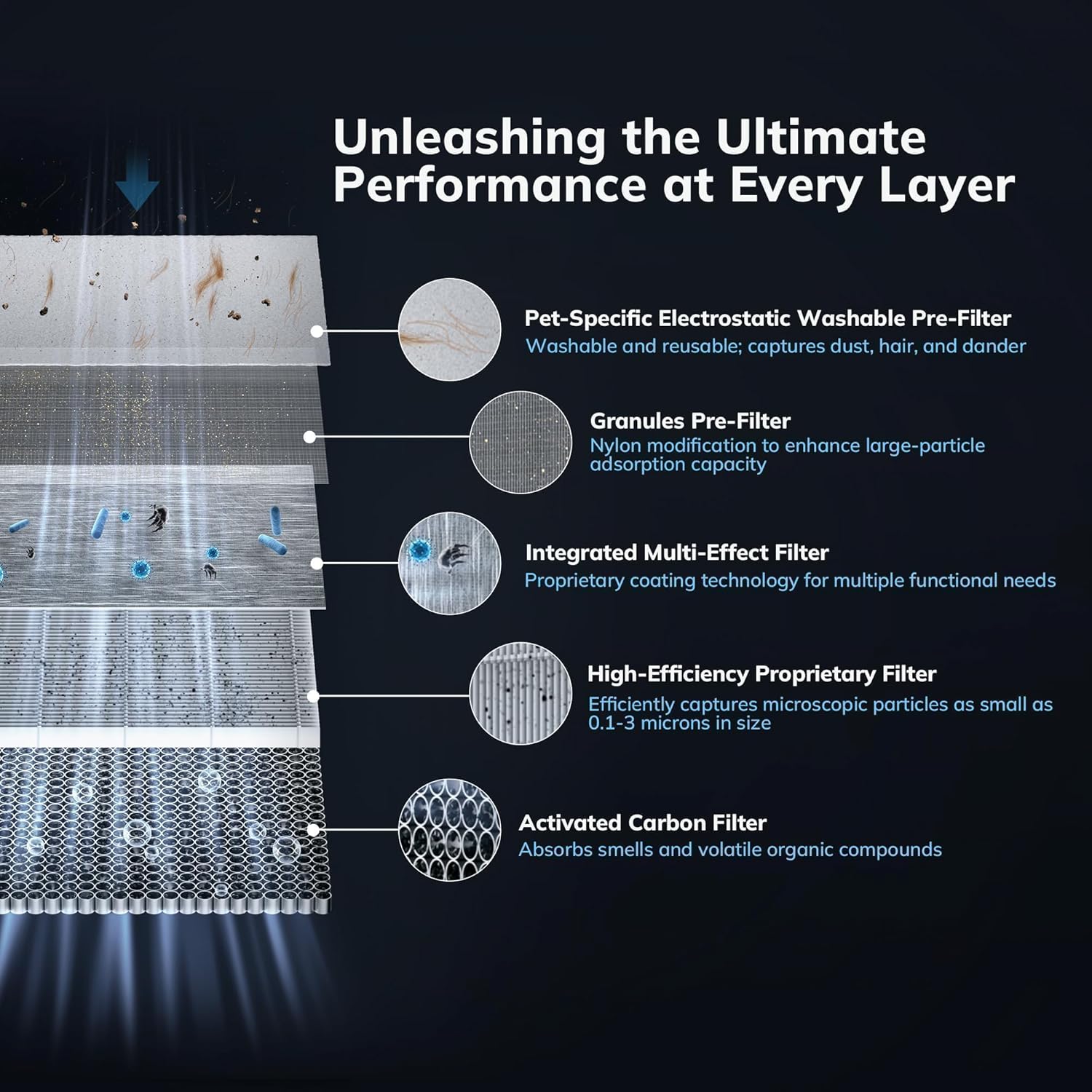 - 【Game-Changing All-in-One Multi-Effect Filter】Breaking the limits of single-function filters with a 5-layer (others only 2–3 layers) and extensive material testing. By integrating multi-effect materials, one filter delivers powerful performance—effectively removing dust, dander, pollen, wildfire smoke, VOCs, odors, and fine particles (independent lab tests on ISO 17025 standards),however, others only have a singular function and cannot handle diverse needs, utimately imposing additional burden