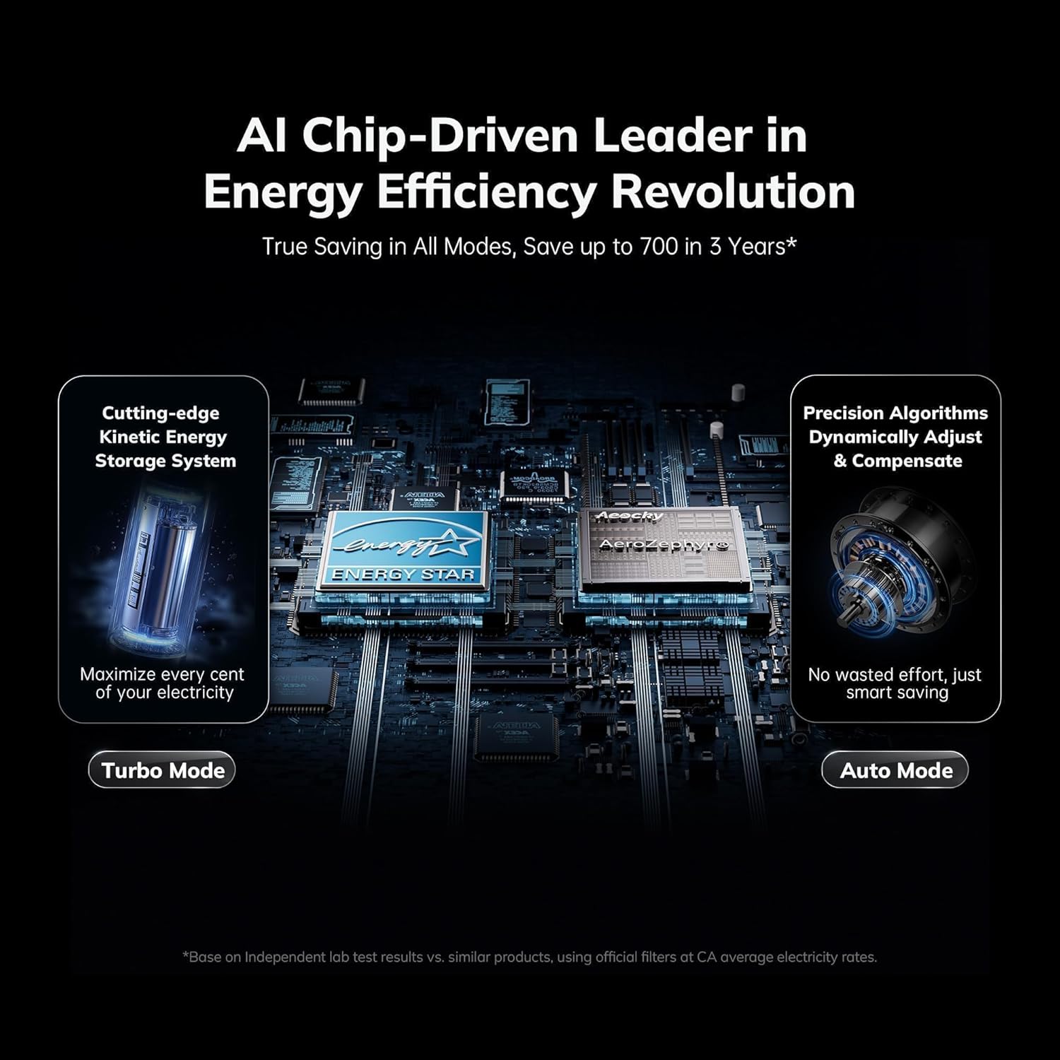- 【AI-Driven Air Quality Monitor & Auto Mode】Equipped with ultra-precise air quality sensor that requires no cleaning or maintenance. Powered by an AI chip with multi-parameter fusion, advanced algorithms, and automatic calibration, it delivers 35% higher accuracy and 60% faster response time than standard sensors. The system displays air quality in real time, and in Auto Mode, it intelligently adjusts fan speed based on current conditions to maintain clean air while optimizing energy efficiency