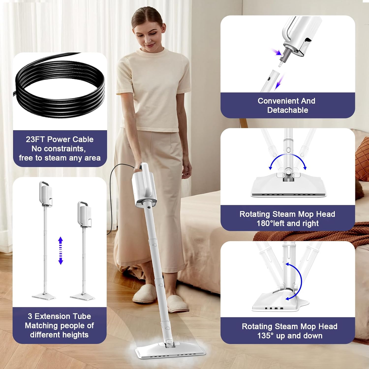 - 【Adjustable and Removable, Convenienct Steam Cleaner】 ✅Equipped with dual cleaning modes, you can choose different mode to fit your needs. The extended 23FT power cord and rotating steam mop cleaner head. With 180-degree horizontal and 135-degree vertical rotation, make cleaning corners and edges a breeze. The three-section detachable pole adjusts to different heights, ensuring a comfortable cleaning experience without any strain.