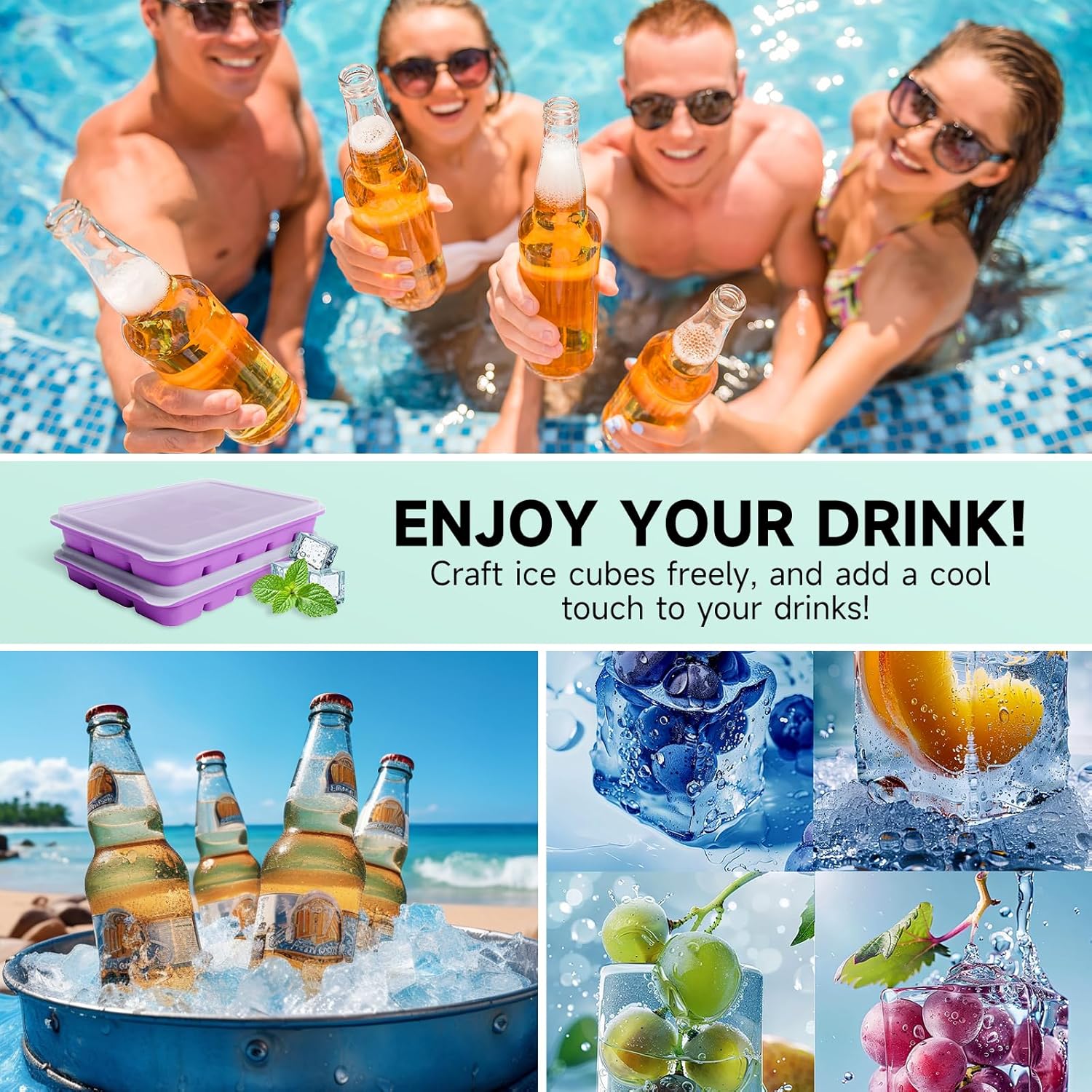 Tvmania Ice Cube Trays Set of 2, Easy Release 15 Flexible Silicone Ice Cube Molds with Removable Lid Reusable Freezer Ice Trays Stackable for Whiskey, Baby Food, BPA Free (purple)
