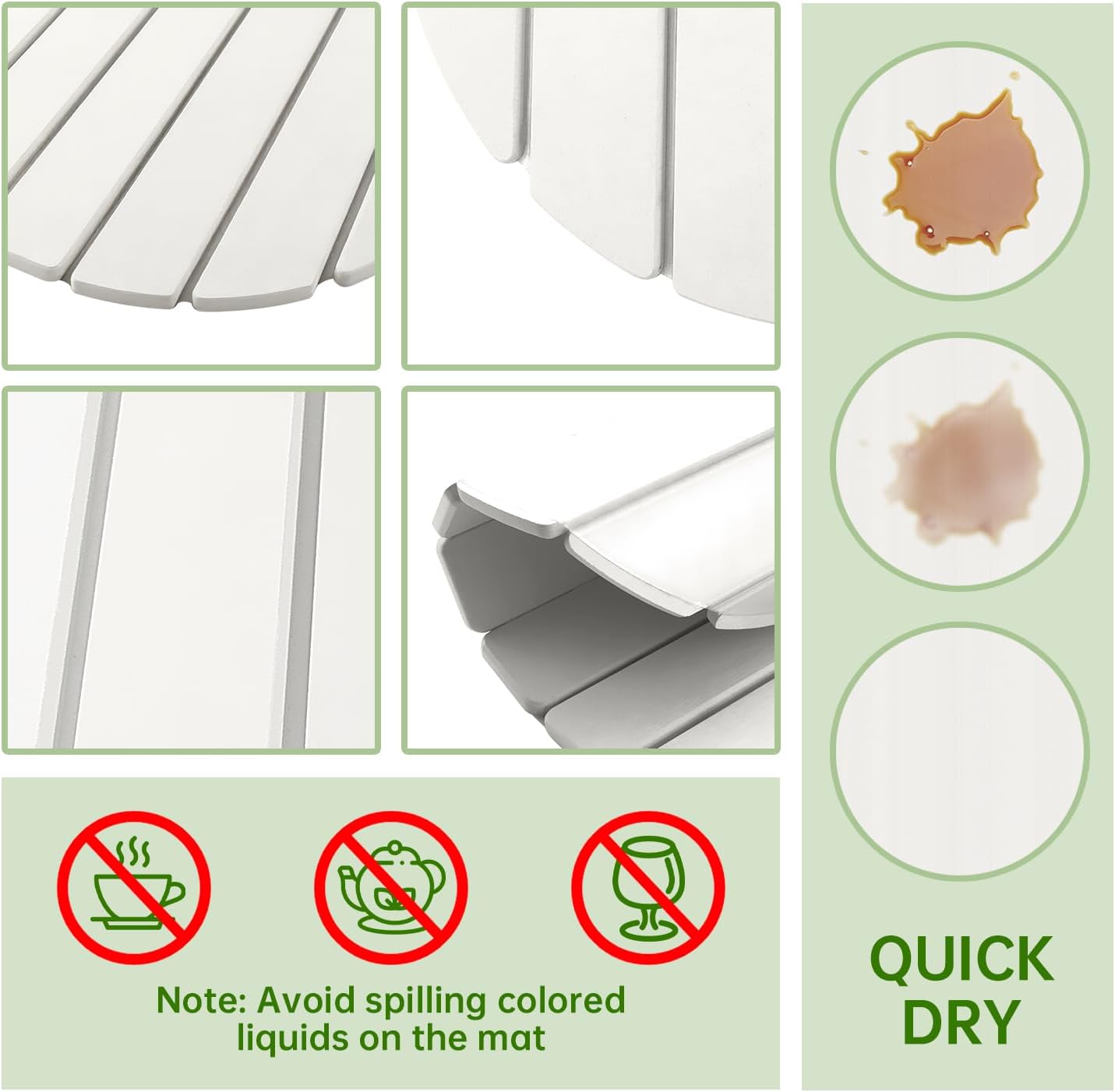 - Foldable and Space-Saving Design: The collapsible design allows quick dry stone mat kitchen to be conveniently rolled or folded for easy storage in drawers or cabinets, making stone drying mat for dishes an excellent space-saving solution for any home.