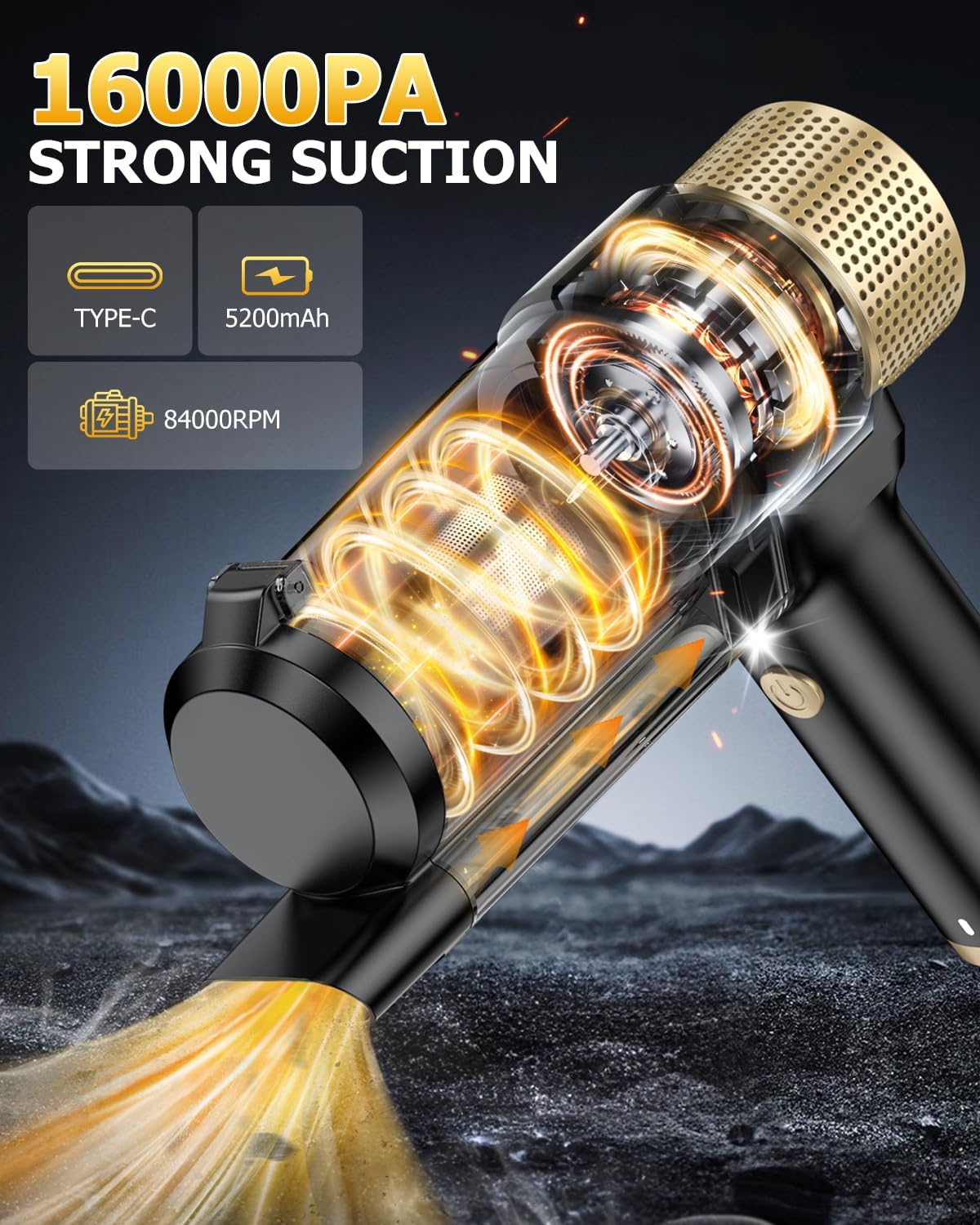 - đă16000PA Suction PowerăThis car vacuum portable cordless features a strong suction power of 16,000 PA and a motor speed of 84,000 rpm, making it quick and easy to remove hard-to-tackle pet hair, fine debris, and other common dirt. Designed to meet your diverse cleaning needs, it efficiently handles various challenges whether at home, in the office, or in the car, taking the hassle out of tidying up