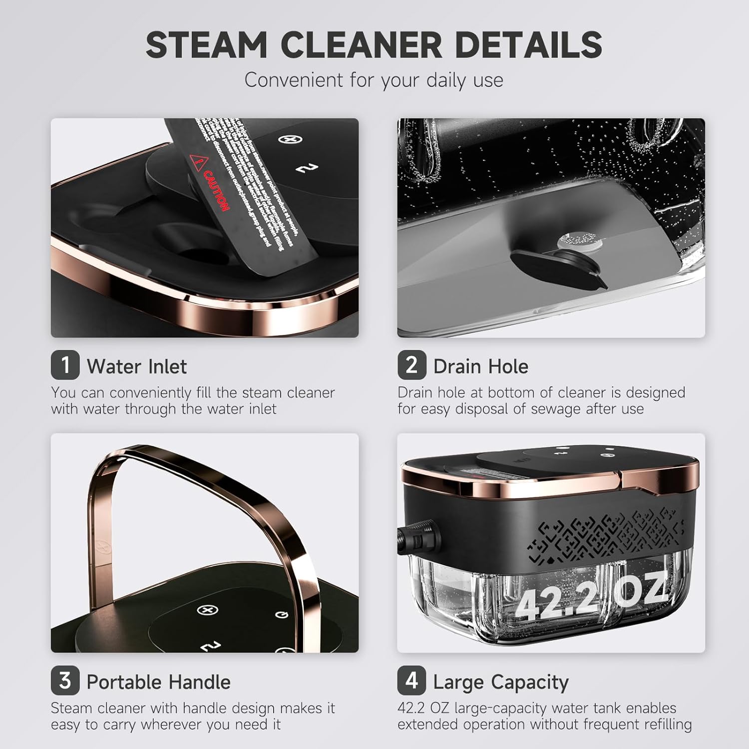 - 【LARGE WATER TANK】The steam cleaner features a 1250ML water tank, which can be used for 45 minutes after one water filling, saying goodbye to the trouble of frequent water filling, allowing you to focus on cleaning.