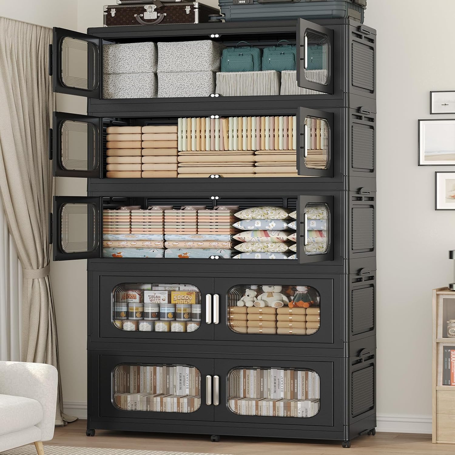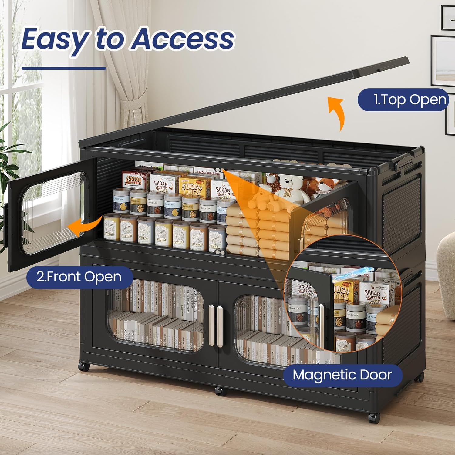 • 【Two Ways to Open & Magnetic Easy Access】The collapsible storage bins with doors and wheels feature a dual access way, allowing for both top and front door openings, and with clear brown windows for easy visibility. The extra large storage bins with open front doors are equipped with magnetic lock buckles to prevent dust from entering the cabinet.