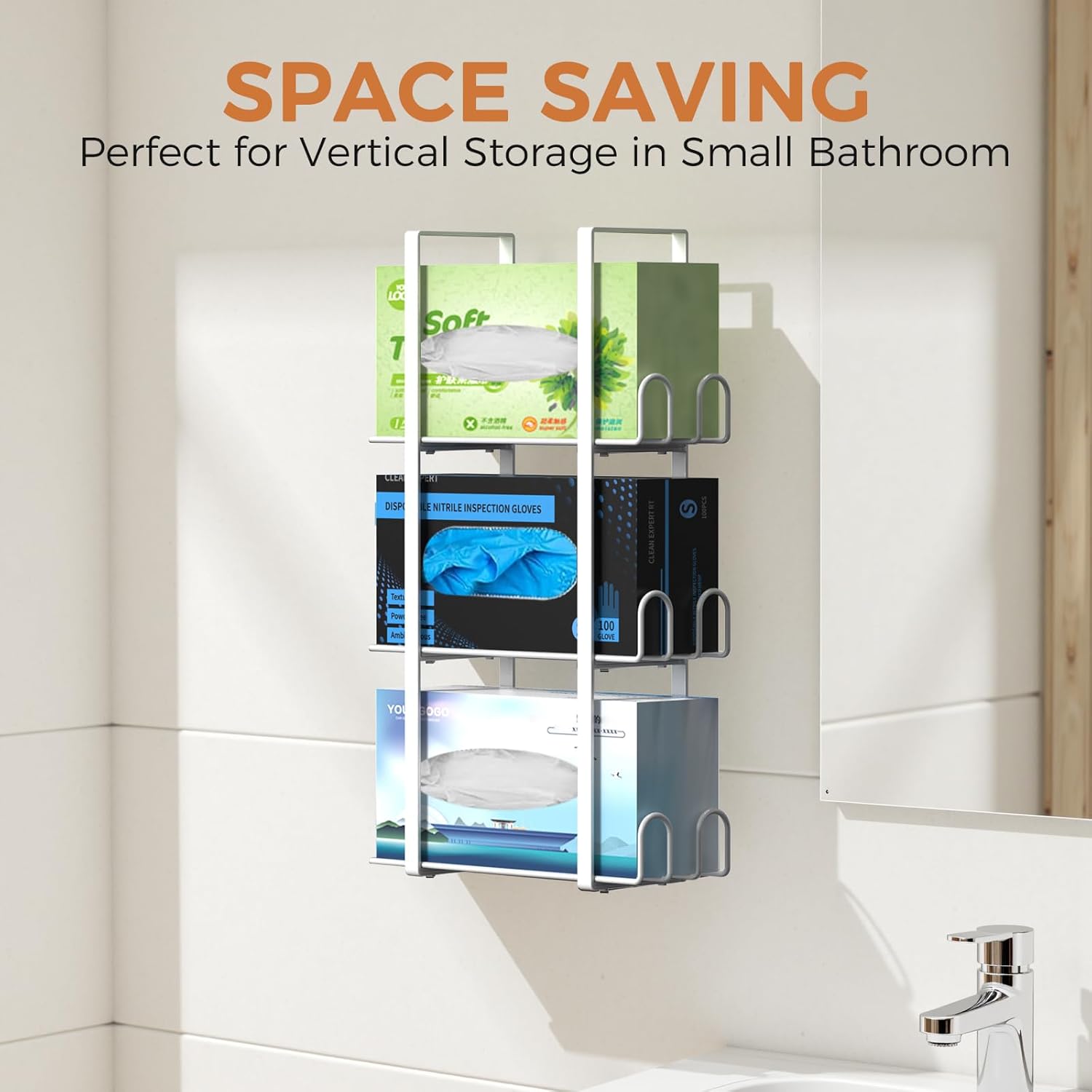- SPACE SAVING AND ALL IN ONE PLACE - Our three-tier glove box holder, with a compact design, efficiently utilizes vertical space. Keeps your counter area clean, clutter-free, and maximizes functionality. The versatile design allows for the use of different sizes in one glove box holder.