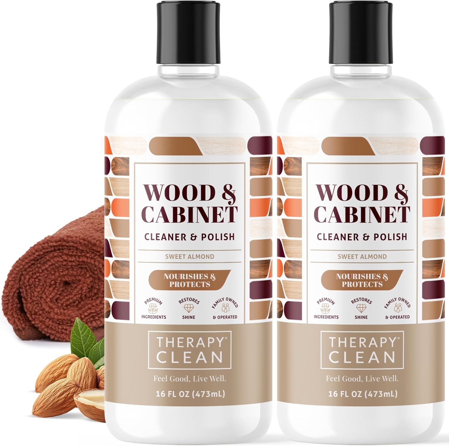 Therapy Wood Cleaner & Polish 16 oz. (2-Pack with Microfiber Cloth) - Wood Cabinet and Table Cleaner - Conditioner - Almond Scent