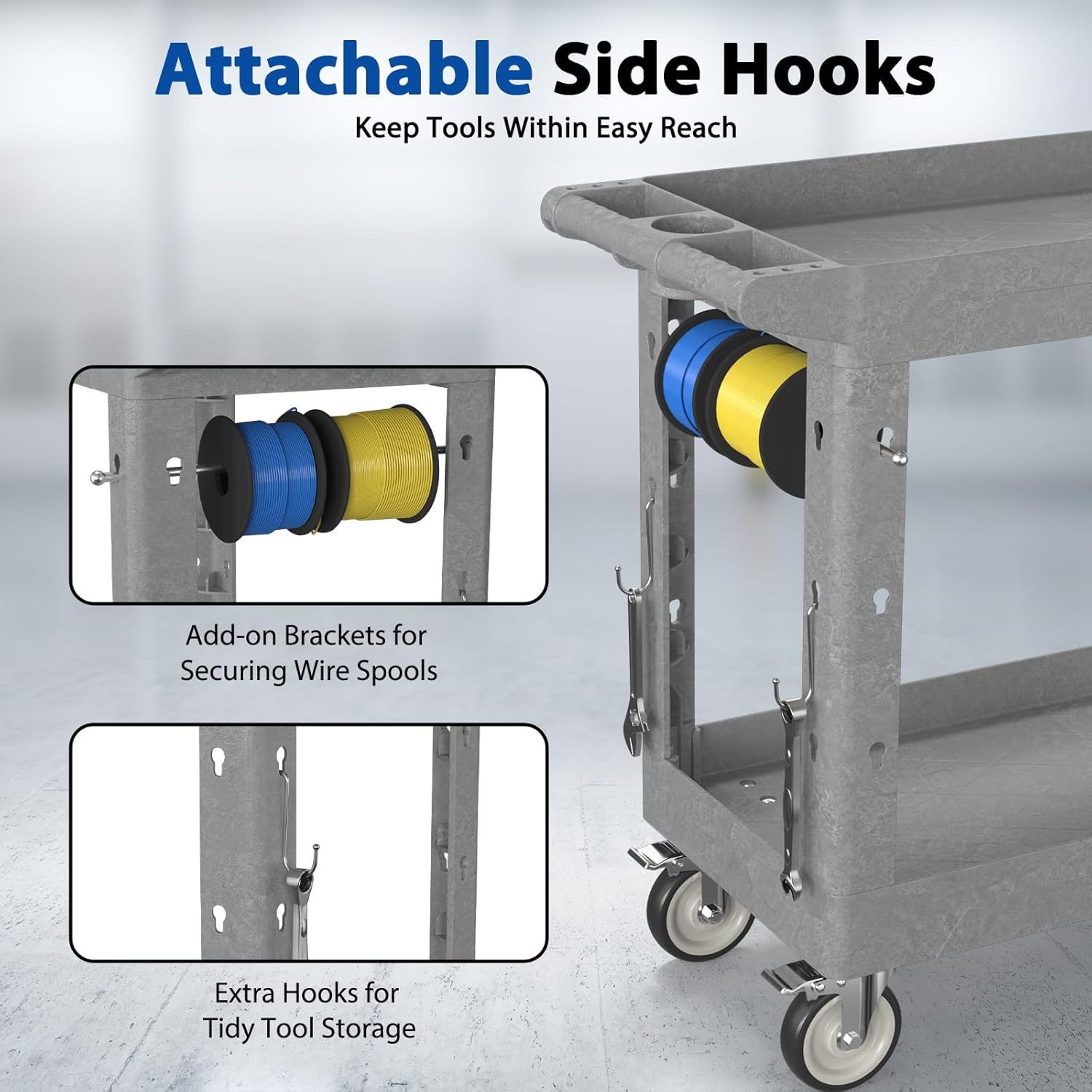 - 【Versatile Side Hole Design】 Multiple side holes allow installation of hooks or accessories to expand storage and organization capabilities. Use as a tool cart, plastic cart with wheels, or multi-purpose utility cart to hold tools, parts, or supplies.