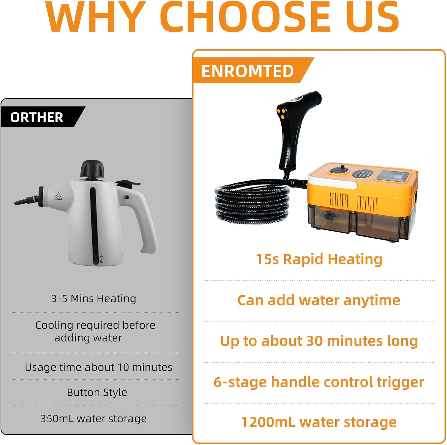 - Home steam cleaner: Steamer for cleaning with a handle-mounted 6-level adjustable steam control, steam cleaners 1500W power operation, delivering 3BAR pressure and 221°F temperature. Heats up in just 15 seconds, and features a 40.58oz water tank (providing up to 30 minutes of continuous runtime), extending use time and reducing the need for frequent refills.It is very suitable for use as a household portable steam cleaner or a grout steamer for tile floors for various surfaces.