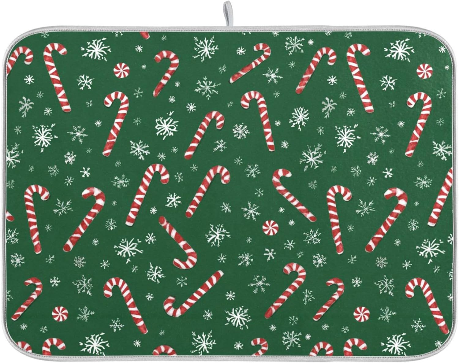 Christmas Candy Cane Dish Drying Mat for Kitchen Countertop 16x18 Winter Snowflake Green Xmas Small Drying Mat Reusable Quick Dry Dish Sink Mats Easy Clean Decorative Essentials