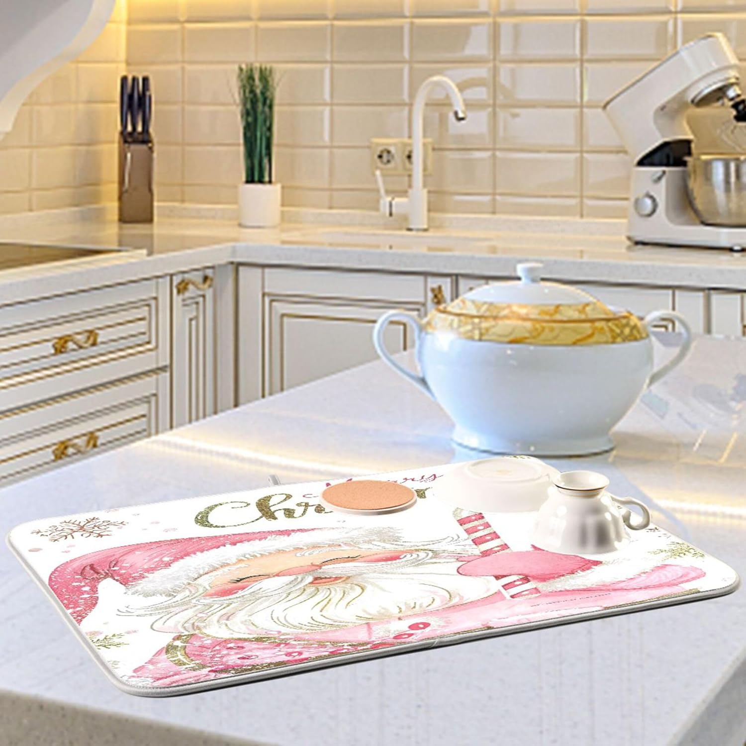 Christmas Santa Claus Pink Dish Drying Mat for Kitchen Countertop 18x24 Xmas Candy Cane Snowflake Large Drying Mat Reusable Quick Dry Dish Sink Mats Easy Clean Decorative Essentials
