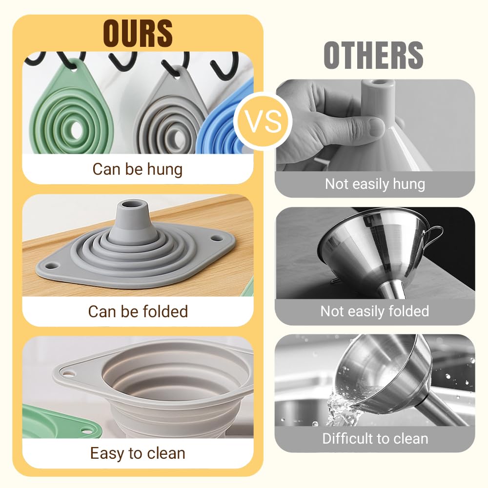 - 【Foldable and Space-Saving】Foldable design makes funnel easy to store, saving kitchen space and keeping drawers neat and organized.